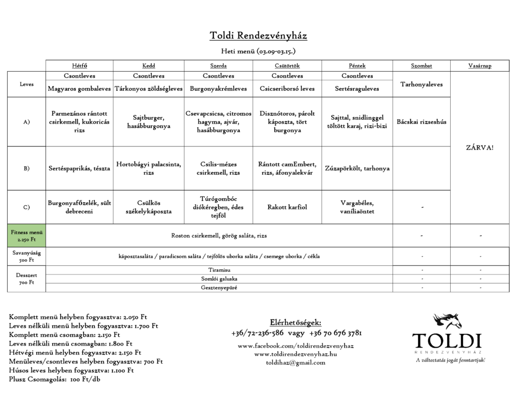 | Fitness menü (Hétfőtől Péntekig): 2.250 Ft |